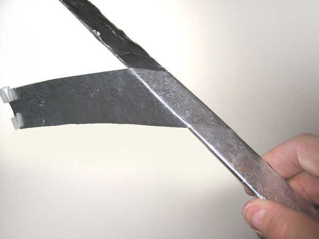 quería un acabado mejor que el que salió el molde. Al principio dije que haciendo de este instructable tenía semejanzas con la fabricación de la espada real. Espada real que si el disco fue lanzado con experimentaría entonces horas de post cast trabajando para que sea perfectamente recto y brillante. Por lo que puede hacer un poco de trabajo aquí lo que desea. Me dio la hoja algunos desechables platos guardé para una fiesta de niños y cubre un lado de la cinta de doble cara y entonces después de cortarlos en tiras, envuelto la hoja para que se vea prolijo. la hoja fue realzado un poco, dando a la hoja un aspecto realmente fileteado.