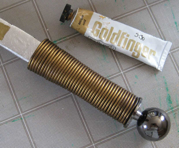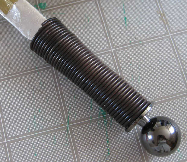 Cuando ya la herida a lo largo de la cola de mango él apagado, luego asegurándose que enmascarar el pomo y la lámina en cada extremo, rocíe el asa metálica negra.
