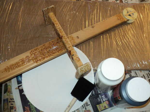 Prime la espada con la pintura para dar un acabado más liso para imitar una superficie de metal.