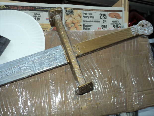 Partes de la espada fueron grabadas con diseños de lujo. Podemos replegar que utilizando algunos 3D gel pintura de tela para dibujar en los diseños. La botella tiene un aplicador de aguja por lo que podemos pintar en líneas bastante finas. Hice mi diseño a mano alzada pero se pueden esbozar en copiar un diseño a la espada.