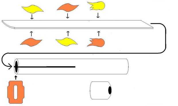 Ahora se inserte el extremo plano de la hoja en las ranuras de la manija y el pegamento en su lugar.  Tomar tu protector de empuñadura (tsuba) y pegar esto en lugar así. Tomar su patrón acrílico y pegar a ambos lados de la hoja, con las pinzas de resorte para mantener en su lugar.  Mientras que usted está esperando la cola curar (debe esperar una buena 24 horas) usted puede decidir hacer un agujero en el extremo de su casquillo de extremo de pipa por lo que se puede acceder al interruptor de la linterna más fácil o simplemente mantener todo y quitarlo cada vez que quiera encender la linterna.