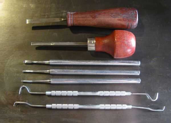 Las herramientas que utilizo para la talla son de arriba a abajo: 1/4 plana chisle, 3/16 redondo chisle plana de 3/16", 1/8 plana chisle, gubia, 1/16 plana chisle, Chisle con punta de pico, punto y chisle exterior pick. 80% de la talla en esta pieza fue hecho con el chisle 1/16.