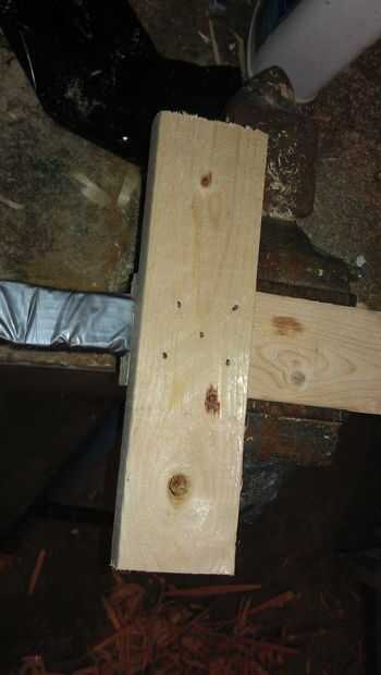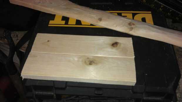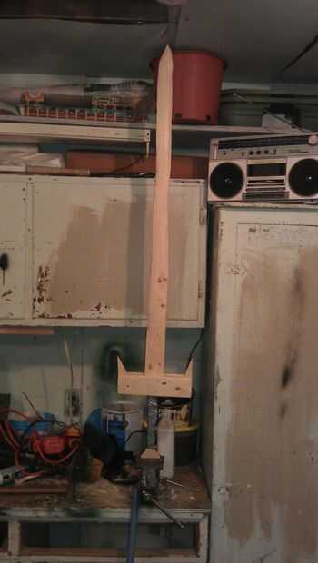 Otra vez, fue comentar la anchura de la empuñadura. Fue aproximadamente 8 pulgadas de ancho. Cuando tuve una pieza corta, decidí que yo desde el pedazo de madera que atraviesa no parecen demasiado buena, así que corte la segunda pieza de la misma longitud y adjunta a cada lado de la espada sobre la empuñadura con 5 clavos cada uno. 2 piezas más fueron cortadas para rellenar los huecos entre las 2 piezas ya instalados. Estos fueron clavados con clavos de 2 a cada lado.