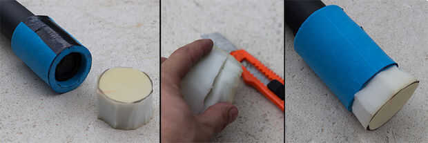 Cortar un círculo de la espuma de célula abierta igual o mayor que el diámetro de la punta del cuello. Cortar un poco la raja en la espuma unos milímetros hacia arriba desde la base (igual a la profundidad del cuello más allá de la base acolchada). En este caso, unos 15mm o más. Este corte le permite exprimir la sección inferior de la espuma en el cuello sin la tapa setas hacia fuera.