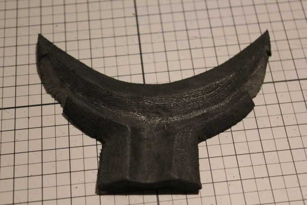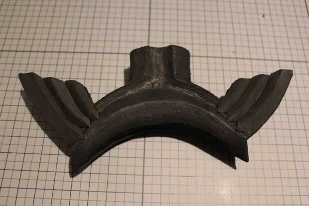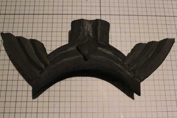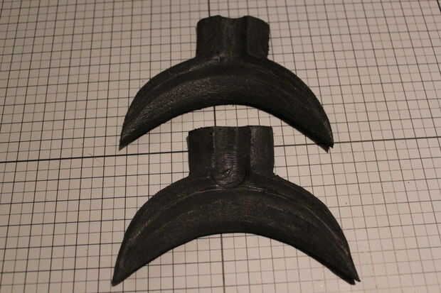 - Para la pieza que se acopla a la hoja, usted necesitará cortar un trozo de la parte posterior por lo que puede caber sobre la hoja. Remontar la brecha desde el patrón de la pieza media y bien afeitado hacia fuera con la dremel o cortar con un cuchillo. Sólo corte la mitad de la anchura de la espuma. A continuación, usted necesitará alrededor del borde de la forma de media luna. Usted también necesita sobre un ángulo de 45 grados cortará el borde. Para el centro de la pieza cuadrada, necesita hacerlo curvado. Mantenga su dremel en mitad de la pieza hacia el borde externo de la crescent y hacia abajo y después del afeitado hasta cumplir con el borde, haciendo una curva en lugar de un borde plano. Si ya no corta la curva, trazar en la línea y utilizar la dremel para tallar hacia fuera.