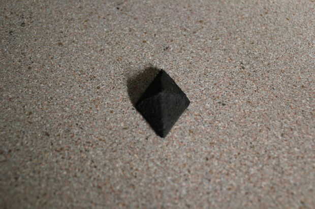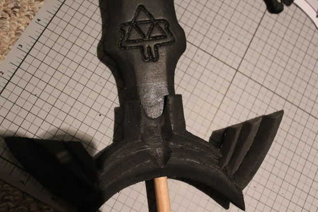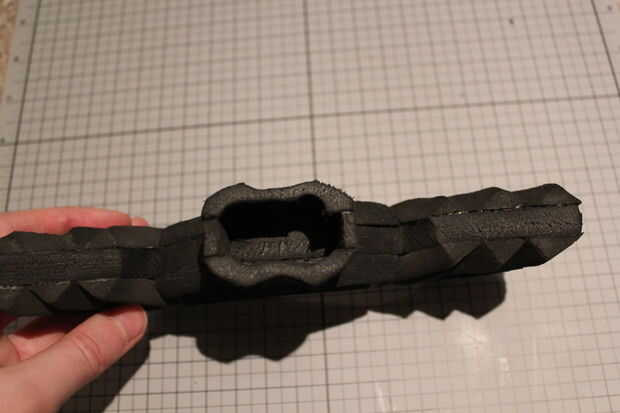 - Para la siguiente parte de la empuñadura, se desea cortar las 2 joya formas con un cuchillo muy afilado. Si eres un pro en ángulos muy profundos con una regla y un cuchillo de corte, puedes cortar la forma de la gema de la espuma sin necesidad de tallarlo. Para ello, tendría que trazar la forma en la parte posterior de su espuma. Utilizando una regla en el interior borde de su línea, sostener el cuchillo en un ángulo que termina en el centro de la joya y hacer los cortes. De lo contrario, recorta las formas normalmente y usar una dremel para tallar las formas con un poco de lija fino. Las formas de talla es muy simple – sólo asegúrese de mantener sus piezas muy bien ya que la dremel tiende a hacerlas volar de tu mano. Se talla un ángulo en cada borde plano hasta que encuentres el centro. Trabajando en dos bordes opuestos y luego el siguiente contrario bordes parece ser la forma más sencilla de hacer esto.