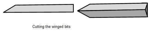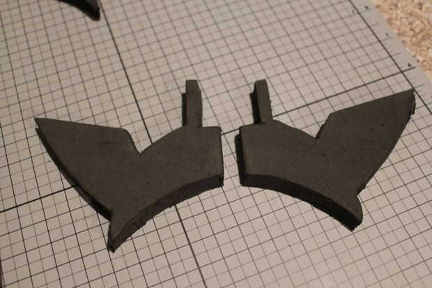 - El siguiente paso es los bits alados. Creación de estos es realmente simple. Con un cuchillo muy afilado y una regla de metal, sostener el cuchillo en un ángulo de 45 grados contra la regla y corte una línea larga de tu espuma. Voltee su espuma alrededor y corte tiras del mismo ángulo para conseguir largos con punta de espuma. Usted necesitará estas tiras de diferentes anchos. Puede utilizar las piezas del patrón para dibujar puntos para qué tan amplia debe ser cada pieza. Tenga en cuenta que son ligeramente más ancho en la parte superior que en la base y que la pieza más externa es la más ancha y la más interna es la más pequeña. Usted tendrá total 12 piezas, pero es una buena idea cortar unos extra en caso de que los cortes son demasiado grandes o pequeños cuando se combinan. Corte cada pieza ya que necesita y Ahuse los bordes para que van a quedar al ras de los cantos tallados en la pieza media luna. Puede hacerlo fácilmente con un par de tijeras a partir de en el filo.