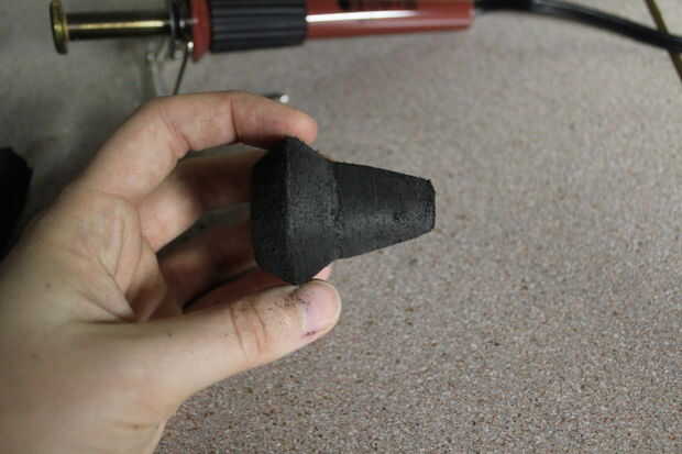Esta pieza está hecha de 5 capas de espuma. Una de las piezas del patrón es la vista lateral, y la otra es la vista inferior. En primer lugar, trace el círculo medio de la espuma 3 veces y cortar hacia fuera. Pegar con cemento de contacto y alise los bordes con una dremel. Dibujar el círculo pequeño en medio de uno de los extremos. A continuación, recortar dos de los círculos más grandes y pegarlos juntos. Utilizar la dremel para suavizar los bordes y luego pegar en la pieza más pequeña usando cemento de contacto. Use una dremel para el ángulo en las piezas de la forma. Use una dremel para tallar un agujero lo suficientemente grande para el pasador, asegurándose de no perforar a través de todo el camino ya que esto está destinada a la tapa de tu espada. Desea que la parte inferior de la espiga para llegar a la parte inferior de tu pomo. En este punto que tendrás que reducir tu pasador tamaño usando una sierra de mano pequeña o herramientas eléctricas. Utilice pegamento Goop u otro adecuado pegamento para el pomo a la espiga.