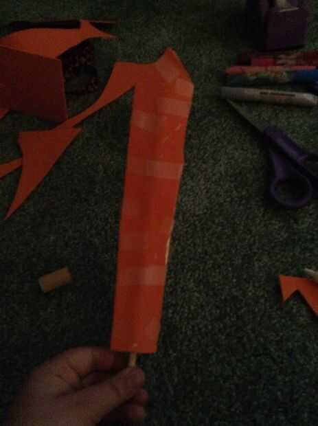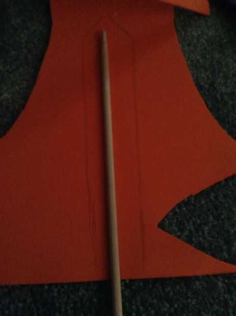 Tomar el palo de madera y se coloca sobre la espuma. Dibujar la base de la espada y cortar las dos piezas. Pegar con el palo en el medio. Asegure los dos lados con cinta scotch.