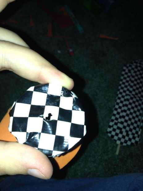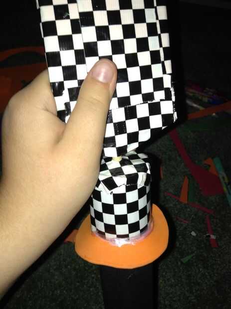 Cubre la parte superior del tubo con cinta adhesiva como en el paso 3. Hágale un agujero en el centro con el lápiz. Insertar el palo de madera que sobresale de la hoja en el orificio que hiciste con el lápiz. Asegúrelo con cinta una cinta.