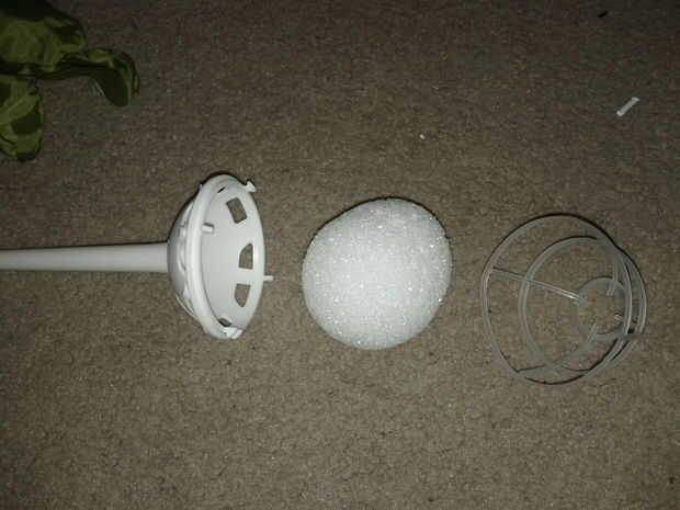 Originalmente tenía un soporte de plástico del ramo de Hobby Lobby. Terminé tomando aparte de salir la bola de espuma de poliestireno. Mi bola era bastante pequeña, que tal vez del mismo tamaño como mi puño. Creo que esto es demasiado pequeño en el extremo para mi empuñadura, pero en el futuro va a utilizar empuñaduras de dagas más pequeño, por lo que sería el tamaño adecuado para aquellos. Tenga en cuenta cómo completo quieres tu ramo y cuán grande será su empuñadura. También sugiero utilizar un completo alrededor de la bola, no un semicírculo forma.