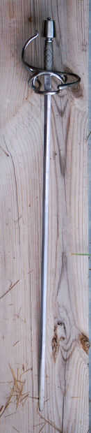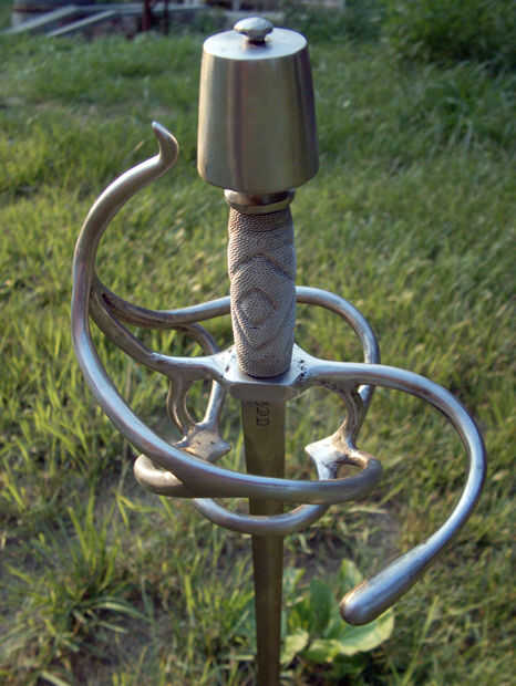 esto es una espada que hice. Construí la guardia, agarre y golpeo desde cero y poner en la hoja del estoque de combate de la etapa. Todo fue hecho de acero, formado con un soplete de oxiacetileno, soldadora MIG, Rectificadoras y varios archivos. El mango es un trozo de madera con un diseño tallado que fue envuelta en alambre, y luego martilló para revelar el diseño.