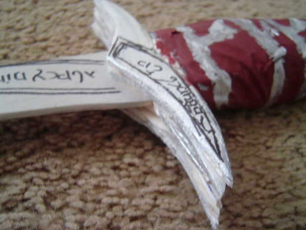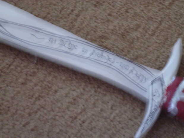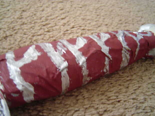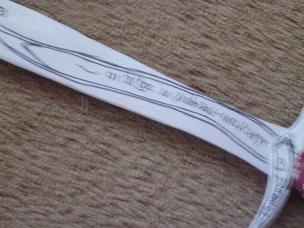He trazado la forma básica, realizada 4 capas de la sección, poner la arcilla alrededor de la handel y golpear y envuelto en cinta adhesiva. Este es mi tercer intento en la fabricación de esta espada, y todavía es bastante cutre.