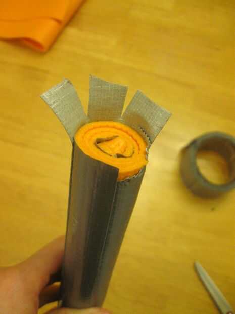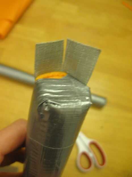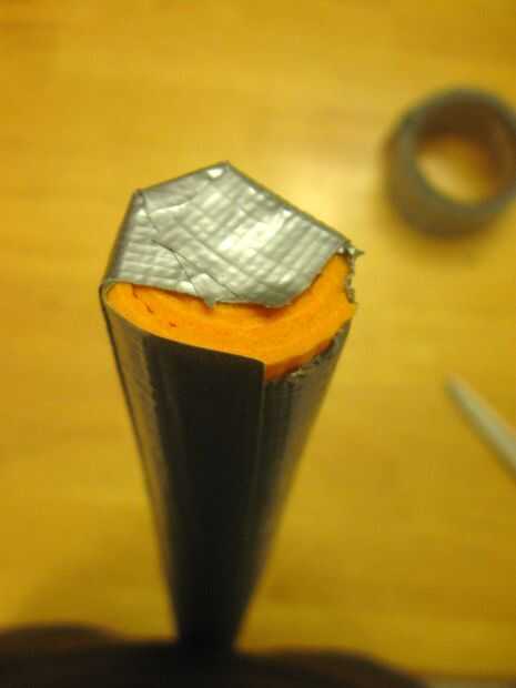 Esta parte es simple. Cubrir todo el "módulo" de tu espada con cinta adhesiva, para que sea más aspecto de metal. Bueno, no sé este aspecto nada como una espada real, cinta o sin cinta, pero parece más uniforme cubierto con cinta adhesiva que con solo una tira de cinta adhesiva por el lado. Cubriéndolo con cinta también fortalece la retención de la espuma y lo hace menos propenso a desentrañar.