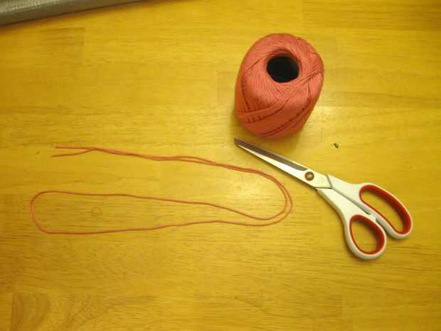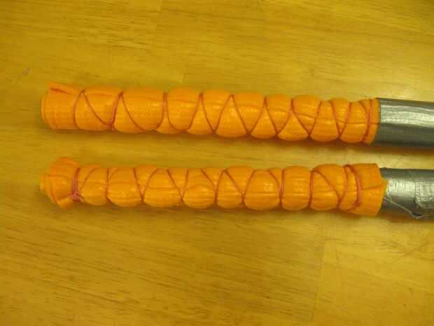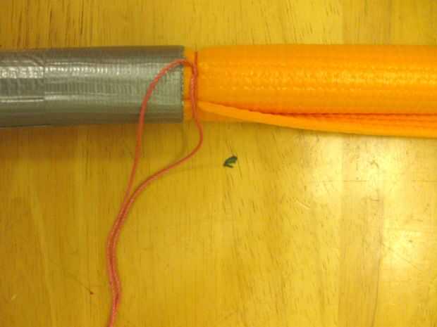 Tomar una sola hebra en cada mano y envolver firmemente alrededor de la manija de la espuma, recorren la cadena como vas. Al llegar a la cima, saque su ayudante otra vez y haga que sostenga la cadena apretada y hacer un nudo bien, fuerte.