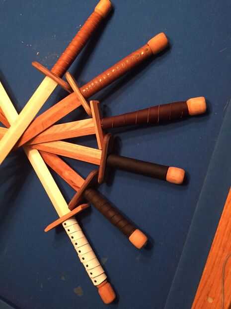 Después mi café de la mañana, se me cayó por mi tienda local de madera a su amplia selección de maderas duras. Terminé comprando una cantidad mínima de nogal, roble blanco, cerezo y arce. (Sinceramente, unos pies de cada uno haría el truco. No tengo una lista pero que usted puede averiguar lo que necesita buscando en mis dimensiones en este Instructable). Como yo fui construcción con ningunas instrucciones o un plan definitivo, decidí que sería tan fácil construir varias espadas en caso llego a cagarla en el camino. Empecé con 6 espacios en blanco y al final, tenía 6 espadas de madera bastante decentes. ÉXITO!!!!!!