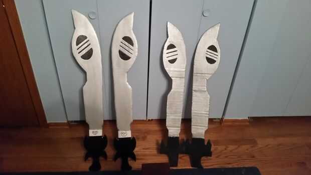 He realizado 3 versiones de estas espadas. Hay una versión de cartón que es lo más barato y más rápido para hacer las espadas del tamaño de la vida. La próxima versión era casi idéntica a la primera, pero con base tablero de la espuma. Estos terminaron mirando mucho más profesional al final. La versión final fue una versión 3D de modelado de las espadas. Se redondean por seguridad y para hacerlas más rígidas.