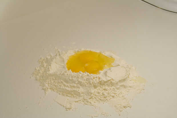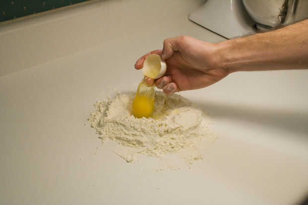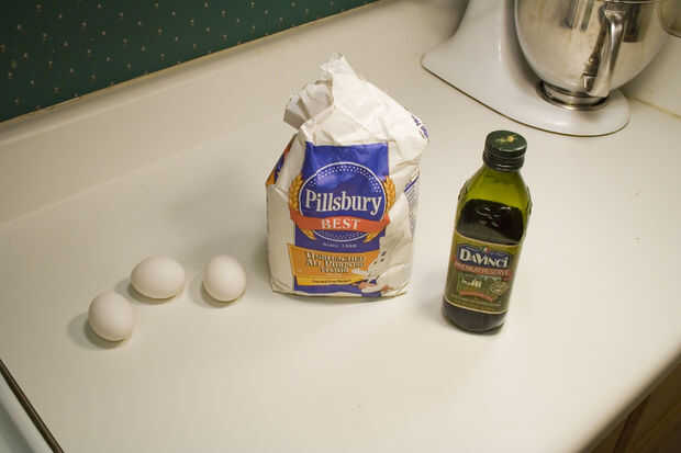 Medir hacia fuera dos tazas de harina y volcar sobre una superficie limpia. Use su mano para crear una depresión en la harina. Romper los tres huevos a la depresión. Añadir 1 cucharadita de aceite de oliva a los huevos.