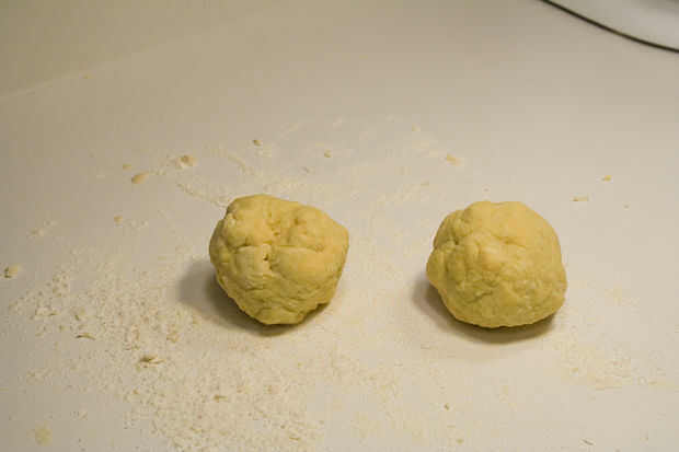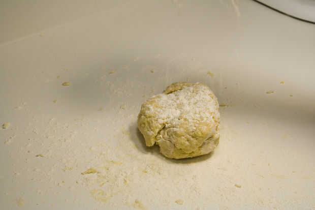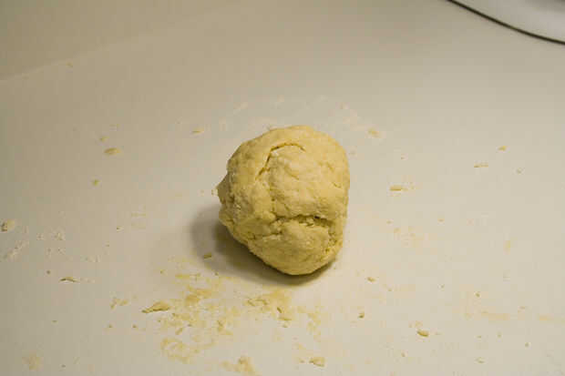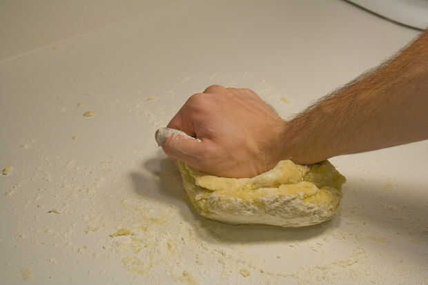 Amasar la masa para un poco y se formará una bola cohesiva. Si la bola se adhiere a la superficie de trabajo o las manos entonces espolvorear harina en la superficie. Amasen la pasta durante cinco a diez minutos.