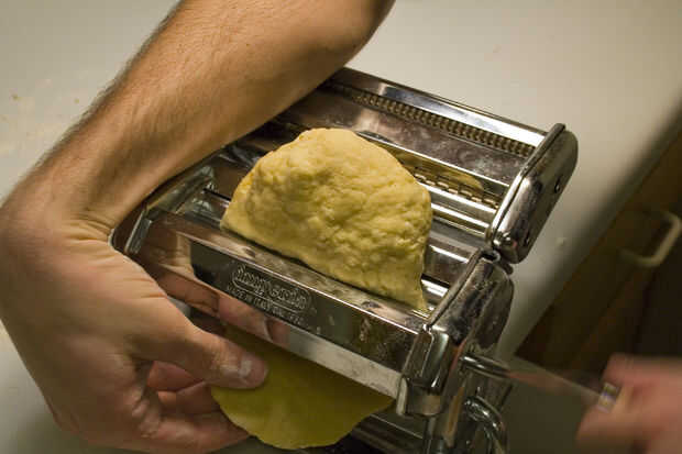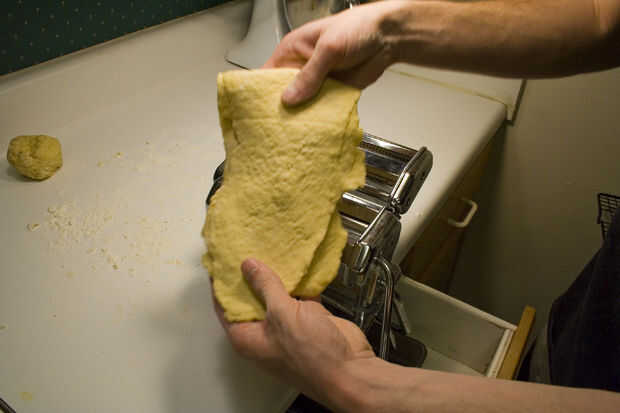 Doblar la masa por la mitad y correr a través de la máquina otra vez. Repetir este proceso 5 o 6 veces, hará que la masa mucho más consistente.