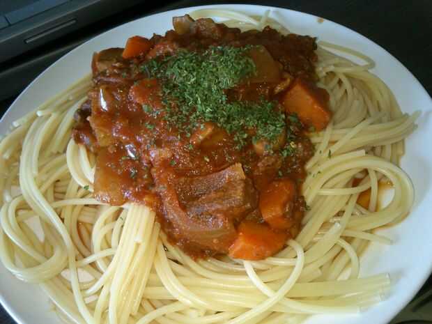 esta es otra variación de mi receta de pasta con carne picada. Supongo que todos aquellos que como había picada de carne y espagueti les encantará esto. Cocinar los espaguetis pasados y se caliente con la carne picada o puede lanzarlas a ambos junto