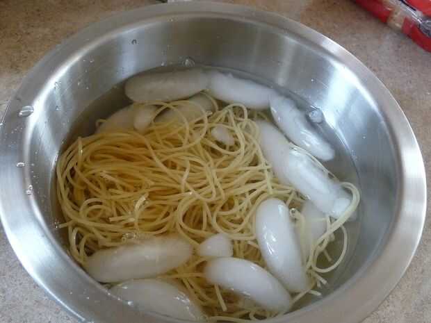 - Poner la pasta en un bol y cubrir con agua con hielo por unos minutos para relajarse.