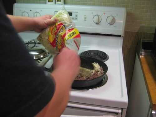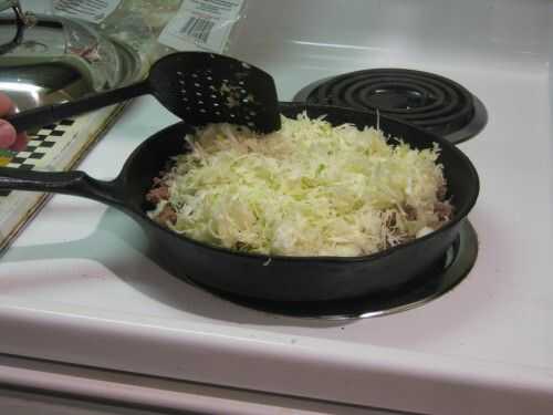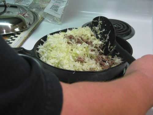Deje que la mezcla de col y carne cocinar juntos durante 5 minutos, revolviendo cada cierto tiempo, hasta que todos de la col es mezclado en ablande, y todo amor del alimento se extiende alrededor. La col habrá absorbido mucho del aceite en este punto, habrá marchitas y lanzó su propia agua, por lo que ahora habrá algún caldo en la sartén, así.