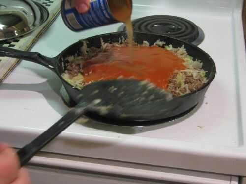 Añadir la salsa de espaguetis en la sartén, o la sopa de tomate o la lata de salsa de tomate/tomate.  Si usted tiene arroz de sobra ahí, añade también, junto con un poco de agua (especialmente si utiliza la sopa de tomate condensada con el arroz - la mitad de una lata de agua es todo lo que necesitas, como ya hay un montón de caldo aquí).