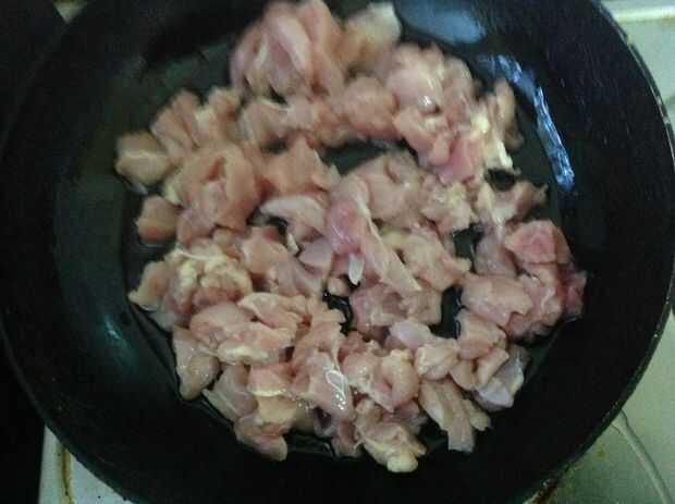 Cortar el pollo en trozos pequeños y freír en una cacerola aparte.