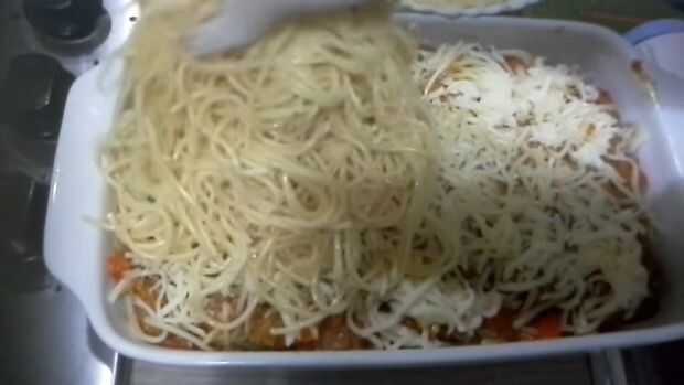 Ahora añadir la otra mitad de los espaguetis y cubrir con el queso mozzarella izquierdo.