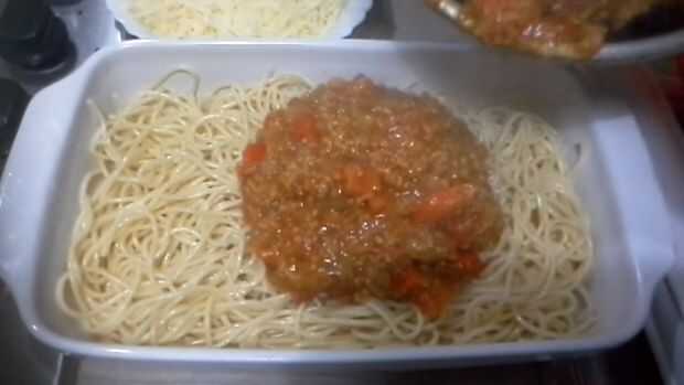 Tomar el plato para hornear y agregue la mitad de los espaguetis cocidos y capa con la salsa de carne picada y la mitad del queso mozzarella.