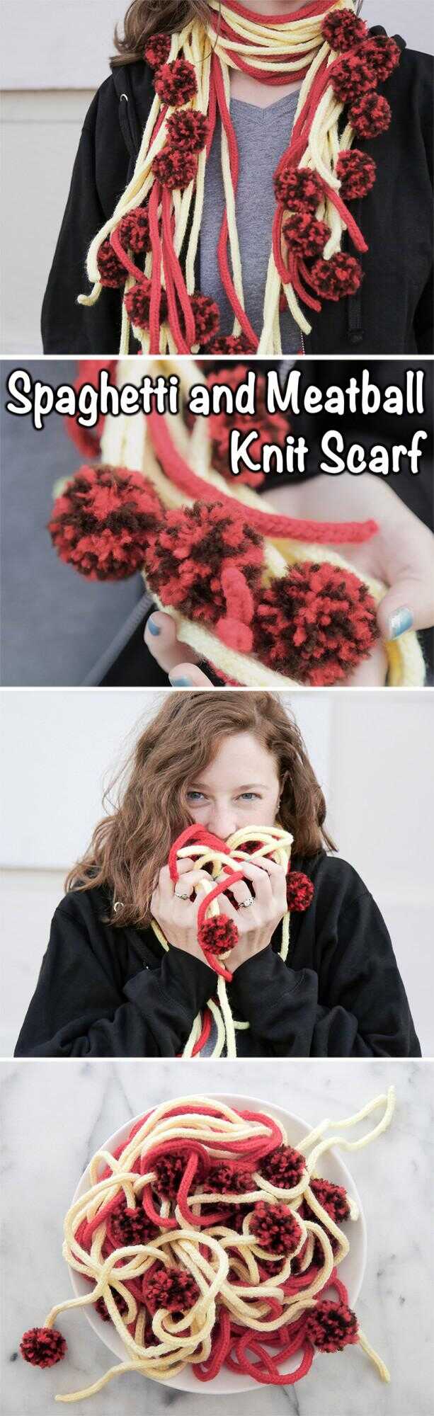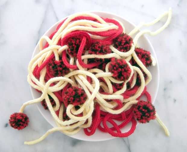 Hace unos años vi una bufanda de pizza que pensé que era genial, pero luego pensé, prefiero espaguetis. Por lo tanto, decidí que necesitaba para hacer una bufanda de espagueti y albóndigas. Este proyecto se sentó en un segundo plano durante dos años y este año, por último, decidí hacerla!