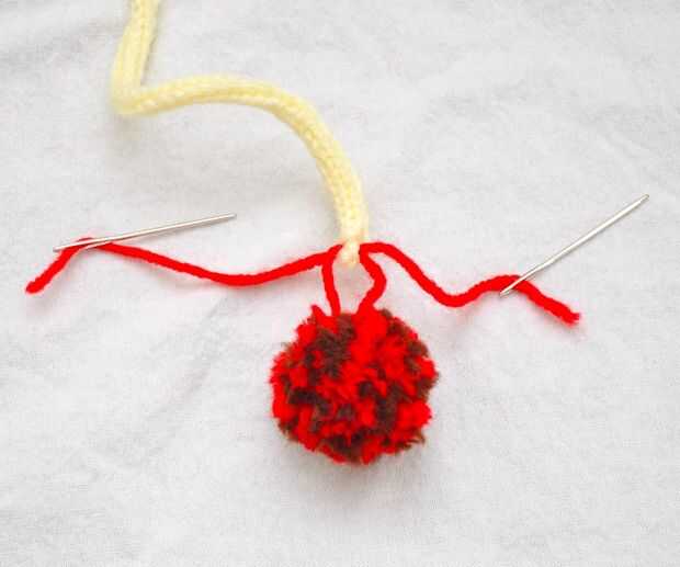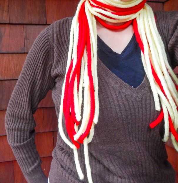 Lo hice por usar la bufanda y luego simplemente atando las albóndigas sobre. Movía hasta que me ha gustado mucho donde estaban. Decidí que no quería que cualquiera donde que envuelve el pañuelo alrededor de mi cuello, pero usted puede poner la tuya toda la bufanda si desea. Originalmente, iba a poner todo en los extremos, pero después de consultar con jessratfink, decidí no gusta de esa manera y poner todo los fideos y no sólo en los extremos. Además, iba a colocar a sólo los tallarines rojos, pero terminó yendo con otra de las sugerencias de Jessy y realmente sólo conectarse los tallarines amarillos, y sólo conecté una albóndiga a cada fideos (tallarines amarillos 10 = 10 albóndigas por cada lado).