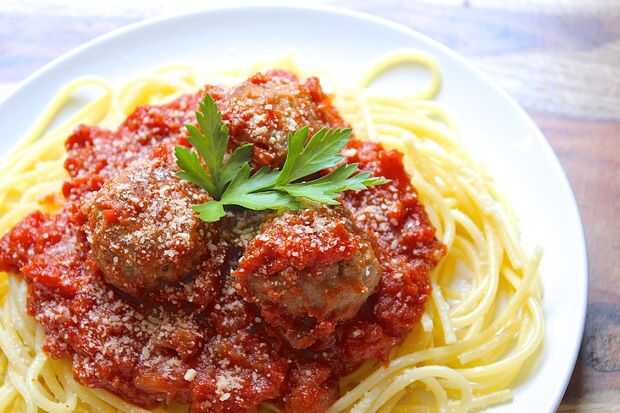 Hace un par de meses me antojo espagueti y albóndigas. He buscado y buscado pero cada receta encontré parecía un poco incompleto. ¿(Crema de champiñon sopa de albóndigas? PUAJ!) Por fin encontré esta receta por Lidia Bastianich, que resultó bastante bien la primera vez. He hecho su espagueti y albóndigas unas cuantas veces, lo afinando un poco más cada vez.