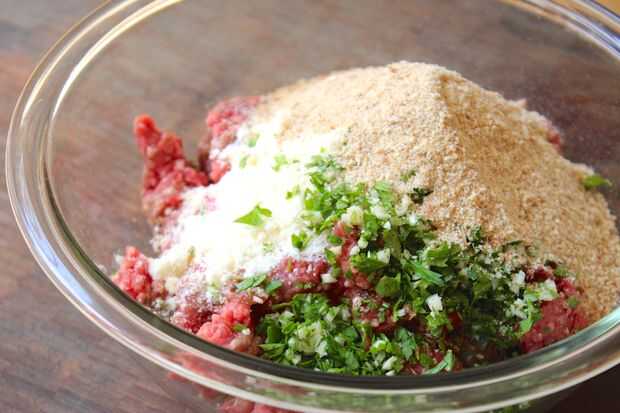 Poner la carne molida en un recipiente de tamaño mediano y agregue todo lo más aparece en los ingredientes de las albóndigas. Mezcle con las manos hasta combinar bien.