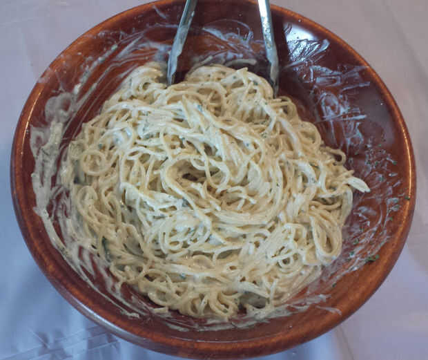 esta es una muy buena extensión de yogur. Es del show de Alton Brown, "Come bien" en la red de alimentación. Tiene un sabor fuerte y picante, con la textura de una suave crema de queso. Esta propagación es mejor en galletitas de agua, pero funci