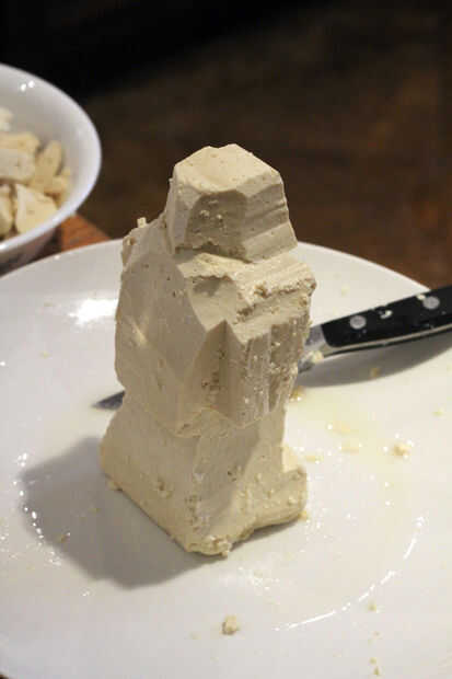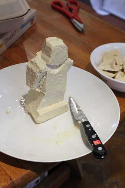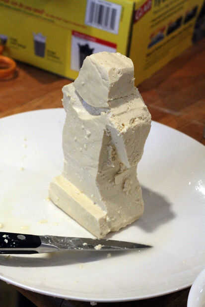 El primer paso es tallar el cuerpo del yeti. Trate de tallar todo de un solo ladrillo de tofu, teniendo cuidado de no hacerlo demasiado fino y débil en cualquier momento. No hay necesidad de detalles finos. ir a por las principales características. Asegúrese de darle un ancho, resistente base para que puede levantarse. Es decir, le dan grandes.