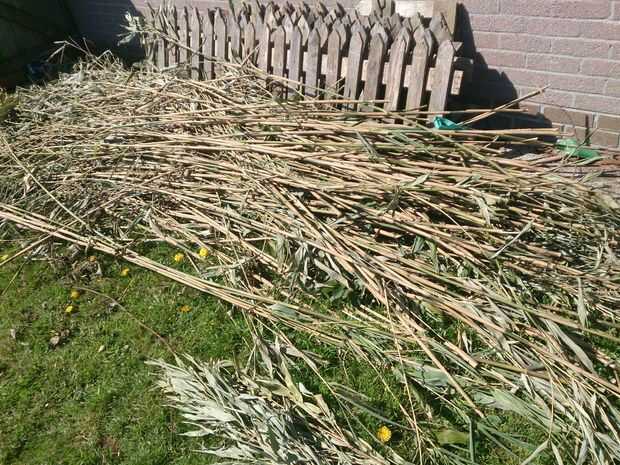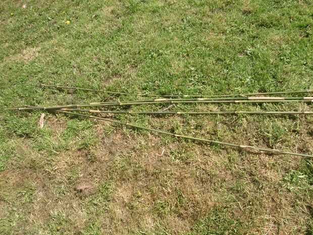 el bambú y se tira de la caja a mano. He dejado esto por unos días al lado de mi casa antes de pelar como sale más fácil. Tomé hacia fuera bambú de espesor similar. Al cortar a la medida, aproxima la longitud necesito y poner los fondos de todo nivel y picados con el mismo tamaño sobre a medio camino para arriba. Si eres quisquilloso, luego medir la distancia.