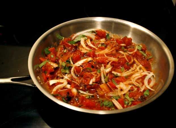 2. Escurra los tomates de lata de fuego asado en cuadritos y agregarlo, junto con los ingredientes recién picados, en una sartén medio caliente.