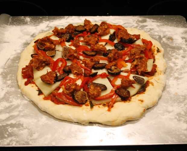 4. salsa de la corteza, colocar los triángulos de queso y encima los higos y pimientos.