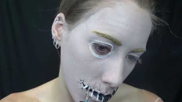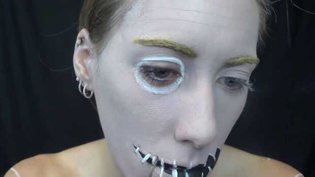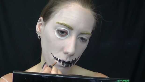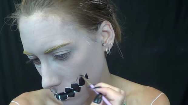 Con pintura de cuerpo blanco llené en la cadena, entonces obteniendo marrón sombra negra hizo aparecer añadir aunque iba en la piel con sombras falsas y también lo hizo que en el lado arrancó a aparecer añadir aunque tiene una línea de sonrisa.