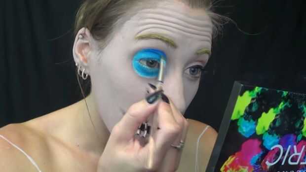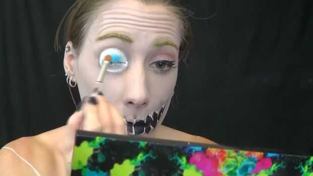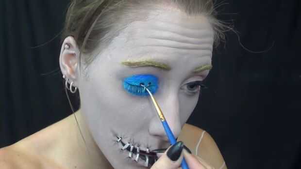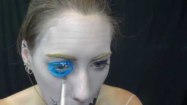 Relleno en el botón con luz azul luego en el exterior con azul oscuro y mezcla. Luego con pintura negra del cuerpo añadir los cuatro puntos en el centro, con pintura de cuerpo blanco hacen el inn de la cadena el centro (haga un x) entonces último añadido alguna sombra de ojos negra en la parte inferior para más de una sombra.
