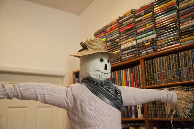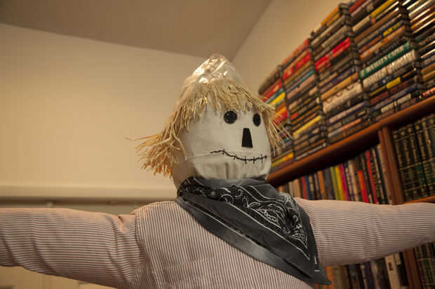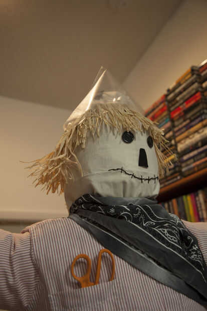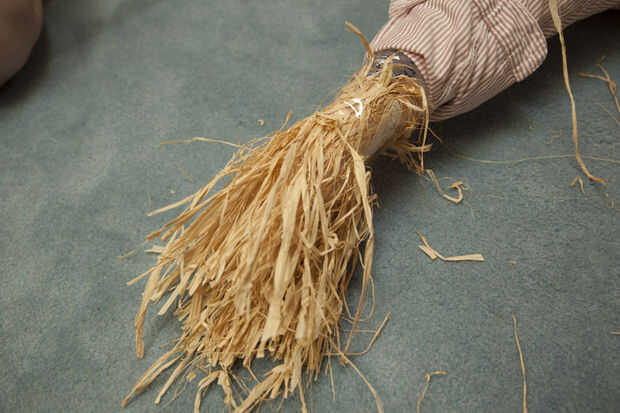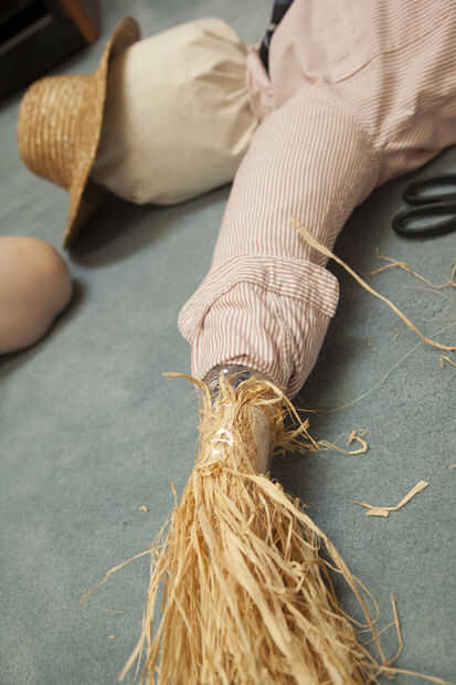Encuentra tu espantapájaros en el soporte sin el sombrero. Coloque una tira de cinta de embalaje sobre una mesa, el lado pegajoso hacia arriba y pat rafia en la cinta. Coge la cinta y se aplica a la línea del cabello, asegurando que el sombrero cubre la cinta. Repetir alrededor de la cabeza hasta deseado peinado se logra, probando el sombrero periódicamente. Recortar trozos si es necesario.