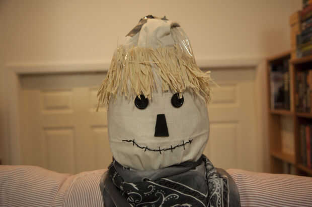Poner el sombrero sobre el espantapájaros. Virar hacia abajo con unas puntadas aquí y allá. Puntada para arriba a través del sombrero, hacia abajo a través del sombrero y a través a través de la tela principal, empujando hacia abajo en el sombrero mientras lo hace. Tenga cuidado de conseguir enredado en el pelo. Tapicería las agujas son más fáciles, si tienes uno, pero haremos alguna aguja.