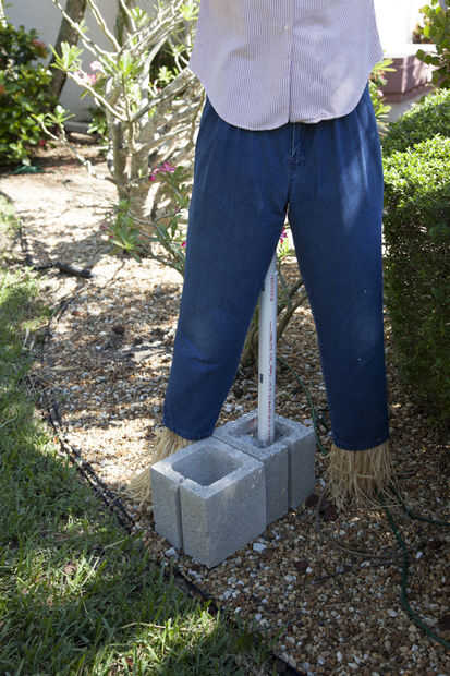 Añadir cualquier toque final (hemos añadido un pañuelo y "cuervo" plumas en su sombrero) y configurar su Espantapájaros y afuera.  El Espantapájaros será pesado adelante, así que si usted utiliza un bloque de hormigón doble configurarlo tal que la mitad con el poste es la parte de atrás.  El polo del cuerpo será giratorio dentro de la varilla de soporte.  Nuestro espantapájaros cayeron sobre su rostro hasta que conseguimos un segundo bloque para colocar en el frente (ver foto).  Dependiendo de su bloque o cubo, no necesitará preocuparse por eso.