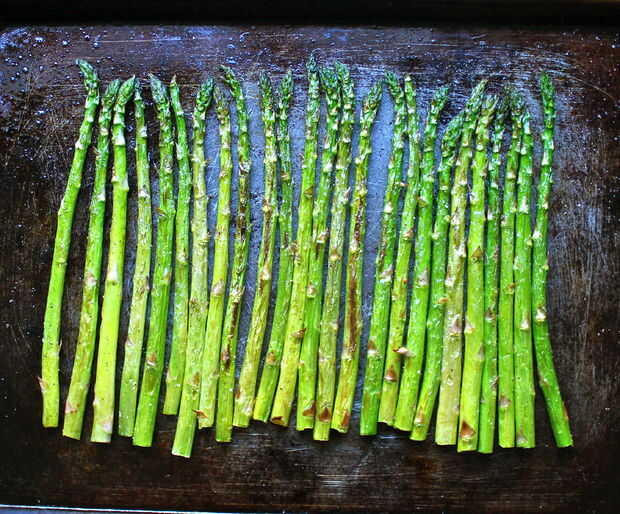 - poner los espárragos en la bandeja para hornear, rociar con aceite de oliva y ser generosos con la sal y la pimienta. (probar mi receta de sal de cítricos para hacerlo aún mejor!) Mezclar todo hasta que los espárragos estén bien cubiertos.