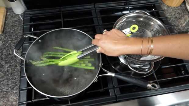 Llevar una cacerola con agua a hervir. Flash hervir espárragos durante unos 30 segundos. Retirar del agua inmediatamente y enjuagar con agua muy fría. Pat seco.