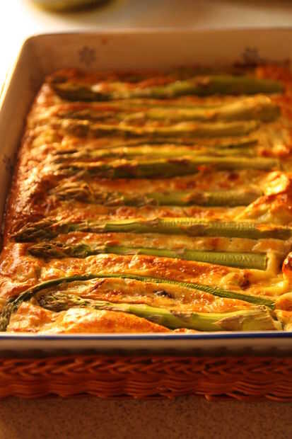 Mantequilla una bandeja de horno, verter la mezcla de huevo y los espárragos en la parte superior.