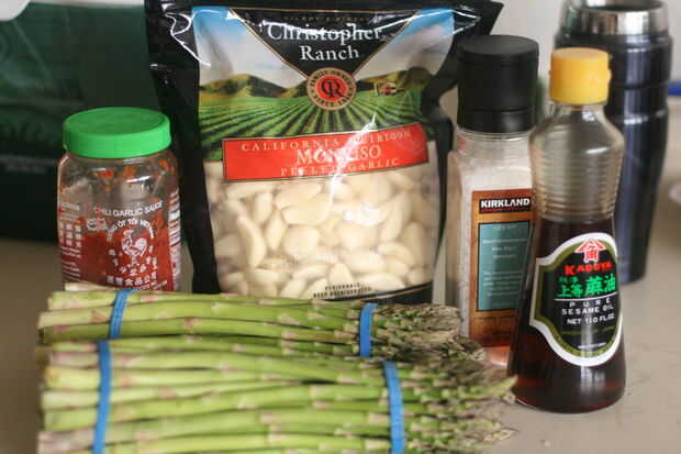 1 lb ½ espárragos, duro termina cortada y corte en pedazos de 2 pulgadas 1 cucharada de aceite vegetal 3 dientes de ajo, finamente picado o a través de una prensa 2 cucharadas sambal oelek (pasta de ají chino) aceite de sésamo 2 cucharadas sal al gusto
