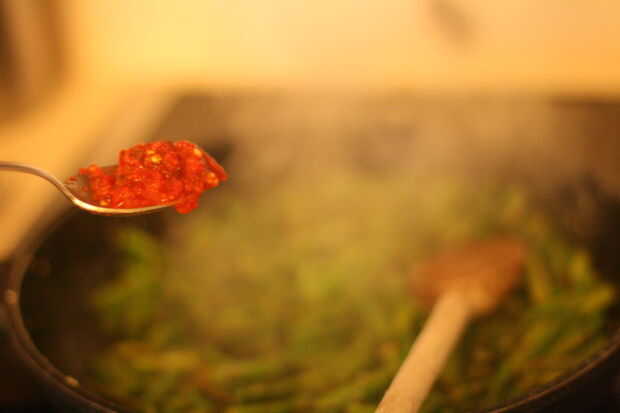 Calentar una sartén pesada sobre fuego medio alto.  Añadir el aceite y el espárrago a la vez.  Cocinar revolviendo hasta que los espárragos comienza girando más brillante verde y se torna un poco sensible.  Agrega el ajo y continuar revolviendo otros 2 a 3 minutos.  Añadir sambal oelek y revuelva, cubriendo todos los espárragos.  Rociar aceite de ajonjolí en todo el plato y el sabor.  Añadir una pizca de sal si es necesario.